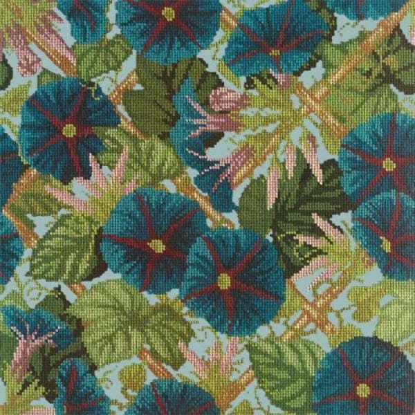 This kit features a 16" x 16" design on a 20" x 20" canvas. The Morning Glory Trellis kit comes with a chart card, printed canvas measuring 10 holes per inch, needles and Elizabeth Bradley Tapestry Wool.
