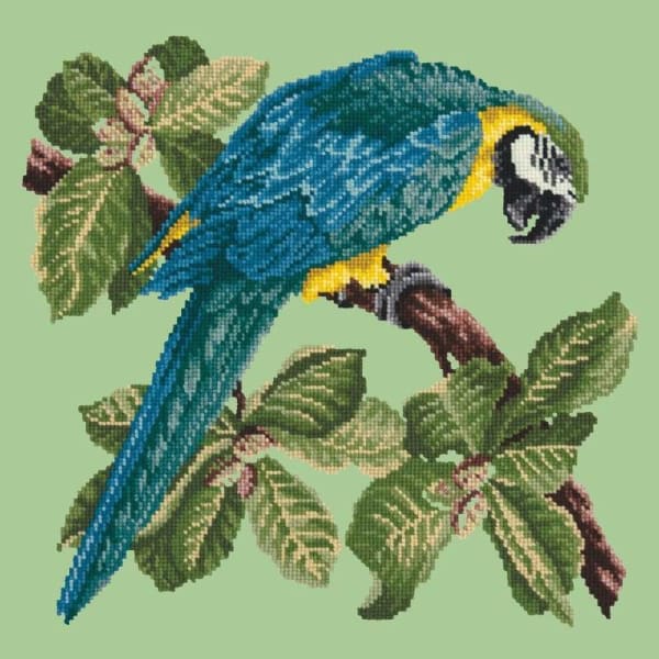 This kit features a 16" x 16" design on a 20" x 20" canvas. The Macaw kit comes with a chart card, printed canvas measuring 10 holes per inch, needles and Elizabeth Bradley Tapestry Wool.